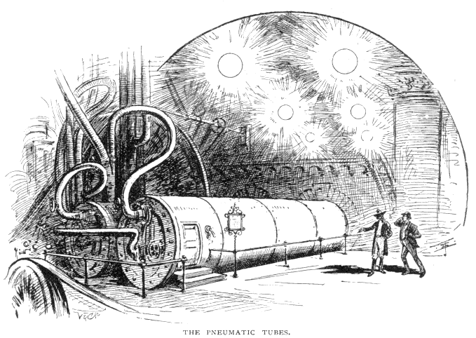 Coming at once to the question of working, he filled the tubes - transformed into a sort of pea-shooter of interminable length - with a series of carriages, to be carried with their travellers by powerful currents of air, in the same way that despatches are conveyed pneumatically round Paris.