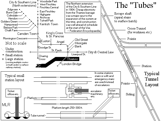 At intervals the parallel tubes are linked by smaller pipes, and there are safety alcoves in the tunnel walls, large enough to hold one or two adults (or several children) every hundred feet. There are occasional escape shafts with spiral staircases or ladders leading up to street level; due to the war most are now covered with tons of rubble and unusable. There are pools of water where the tunnels pass close to underground streams or sewers; normally they would be pumped dry, but without electricity the pumps aren't working. Near some stations branch tunnels lead to sidings used for trains that have been taken out of service; if you are feeling generous the children may even find a train, with oil lamps, torches, fire axes and other useful stuff in the cab. If for any reason they've made Golders Green too hot for themselves - for example, if they've been caught stealing - a train in a siding would make an excellent hideout.