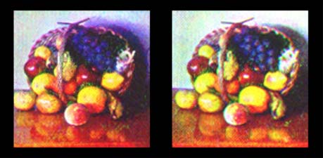 apple are all faithfully rendered; while the iridescence of glass, the