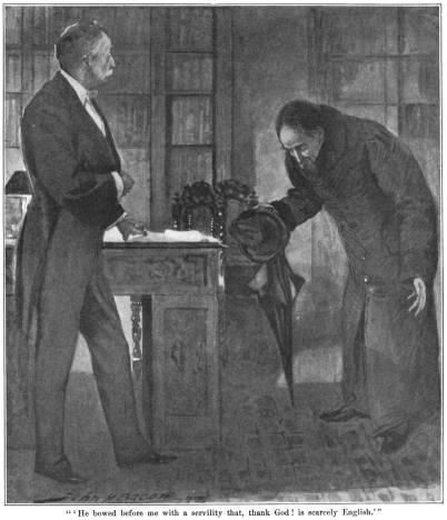 "As the man, whoever he was, had predicted, this did make me change my mind. I immediately bade Jenkins return and inform him that I would be with him in a few moments. Accordingly, as soon as I had dressed, I left my room and descended to the study. The fire was burning brightly, and a reading-lamp stood upon the writing-table. The remainder of the room, however, was in shadow, but not sufficiently so to prevent my distinguishing a dark figure seated between the two bookcases. He rose as I entered, and bowed before me with a servility that, thank God! is scarcely English. When he spoke, though what he said was grammatically correct, his accent revealed the fact that he was not a native of our Isles.