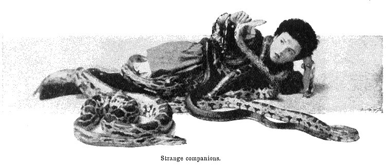 There is also the danger of losing snakes through climatic disadvantages and diseases -- such as canker in the mouth -- to which they are peculiarly liable. To expose them to the cold, either by forgetting to renew the hot water, or by not providing them with sufficient blankets, might very easily prove fatal to the entire collection. But snakes, no matter how tame they may become, are always treacherous, and have to be very carefully watched at every performance. The performer, however, soon learns the temperament of each one, and can tell its mood by its hiss, which varies as its humour is good or bad.
